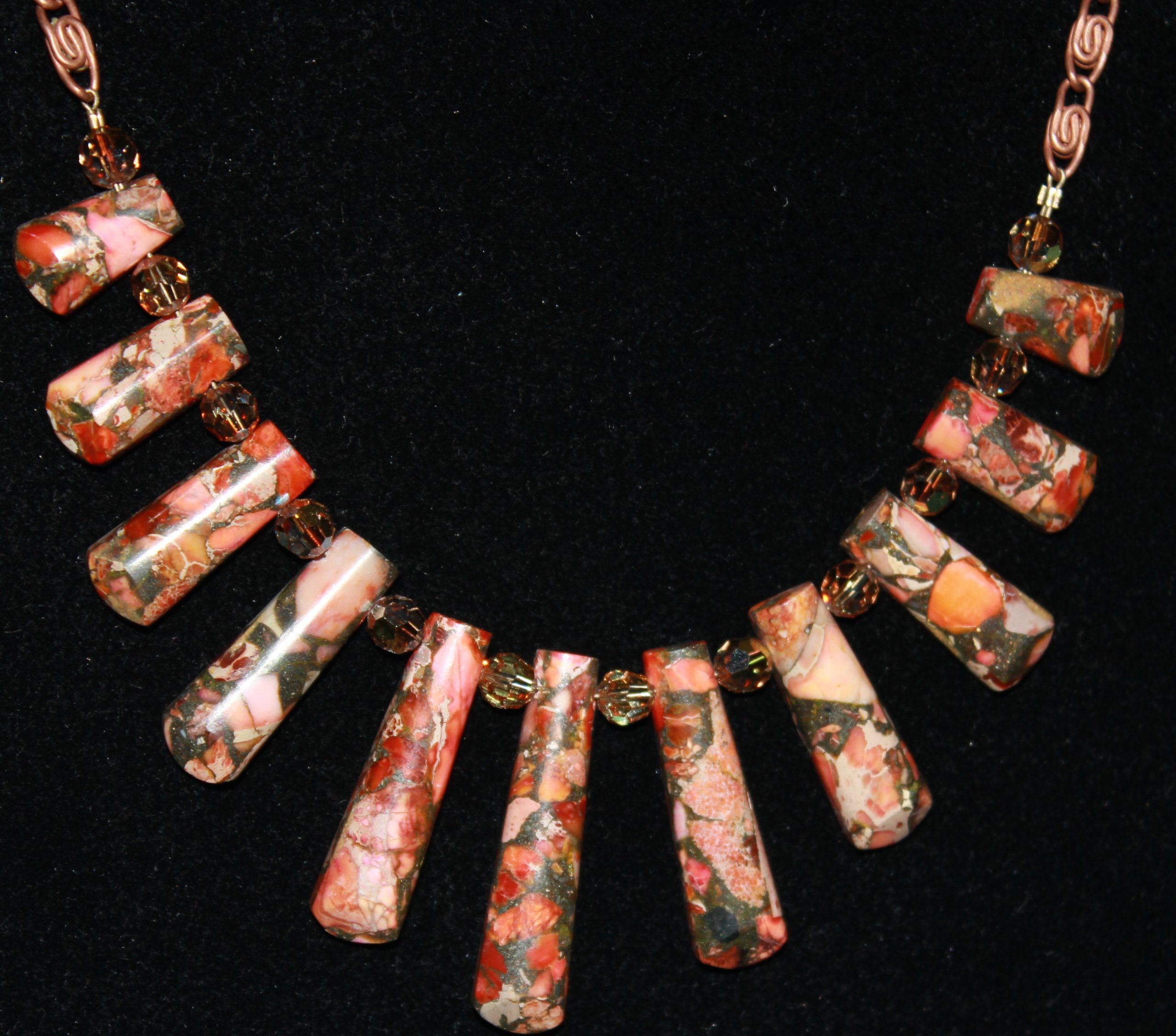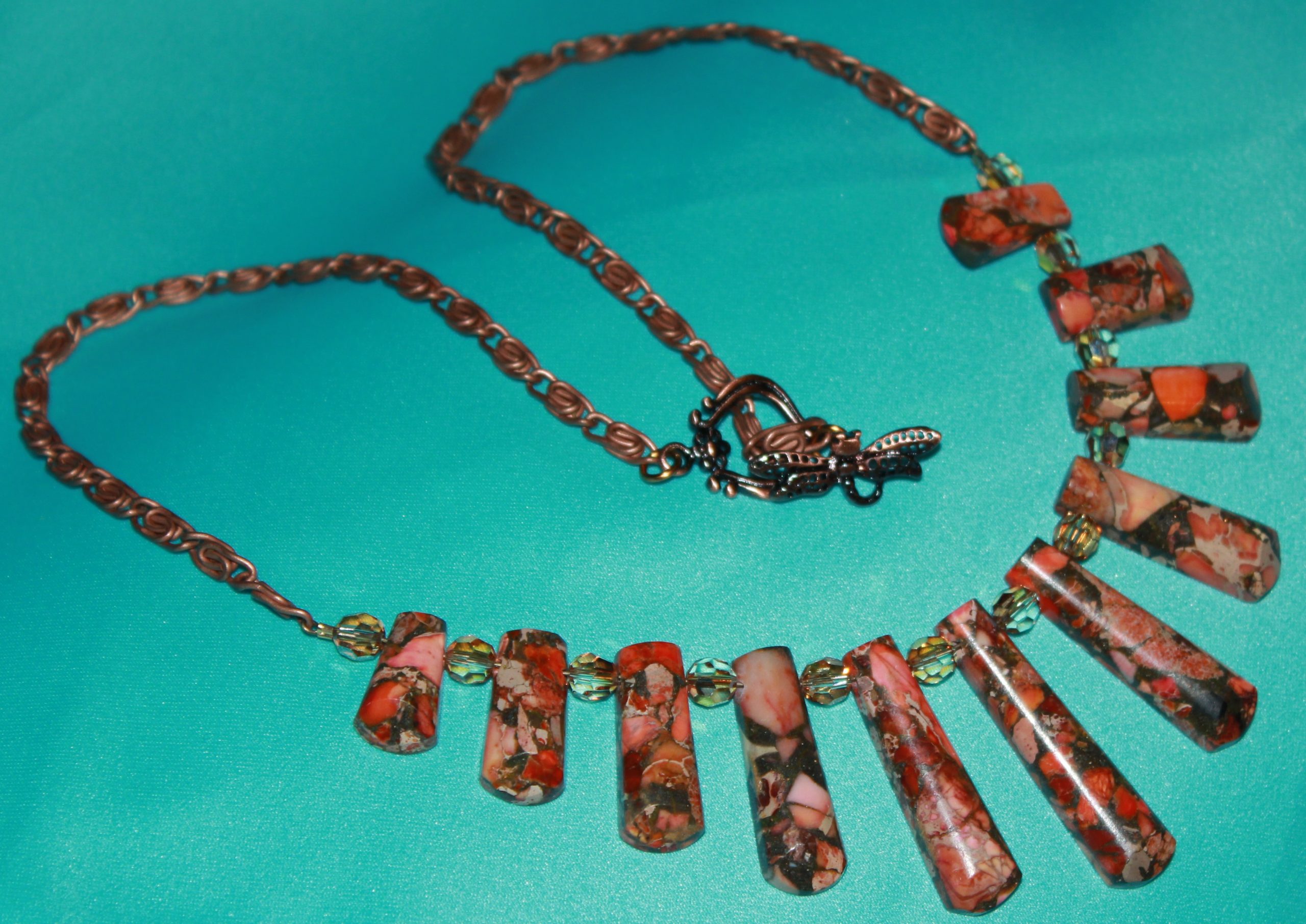 22″ Necklace, Dakota Stones Orange Impression Jasper 11-Piece Ladder with round Swarovski Metallic Sunshine beads. The chain is a double S Link copper-plated design with a Dragon Fly Design toggle clasp. NPnGmSwCp01
